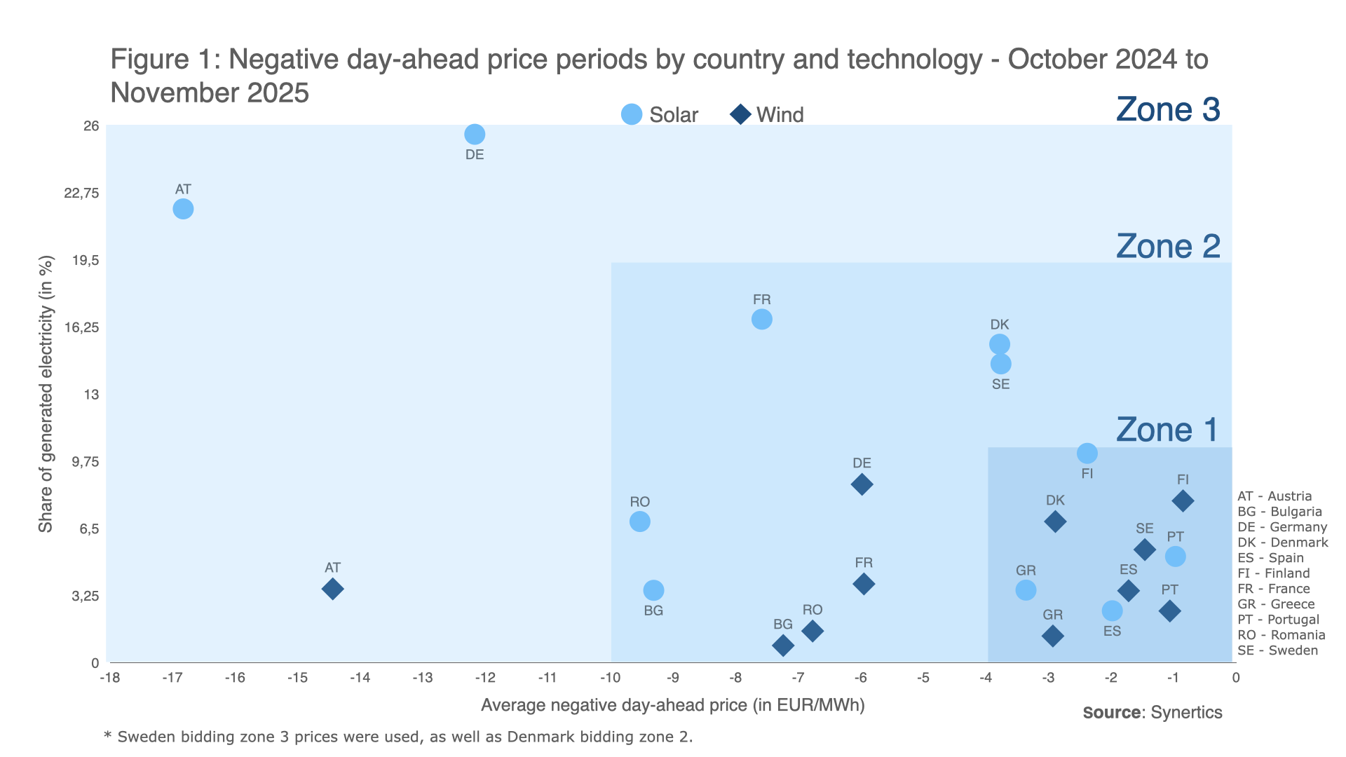 For this analysis, Synertics looked at 11 European countries between November 2024 and October 2025, using the specific solar PV and onshore wind generation profile of each country. To assess how negative-prices events affect different regions of Europe, Synertics used as indicators: