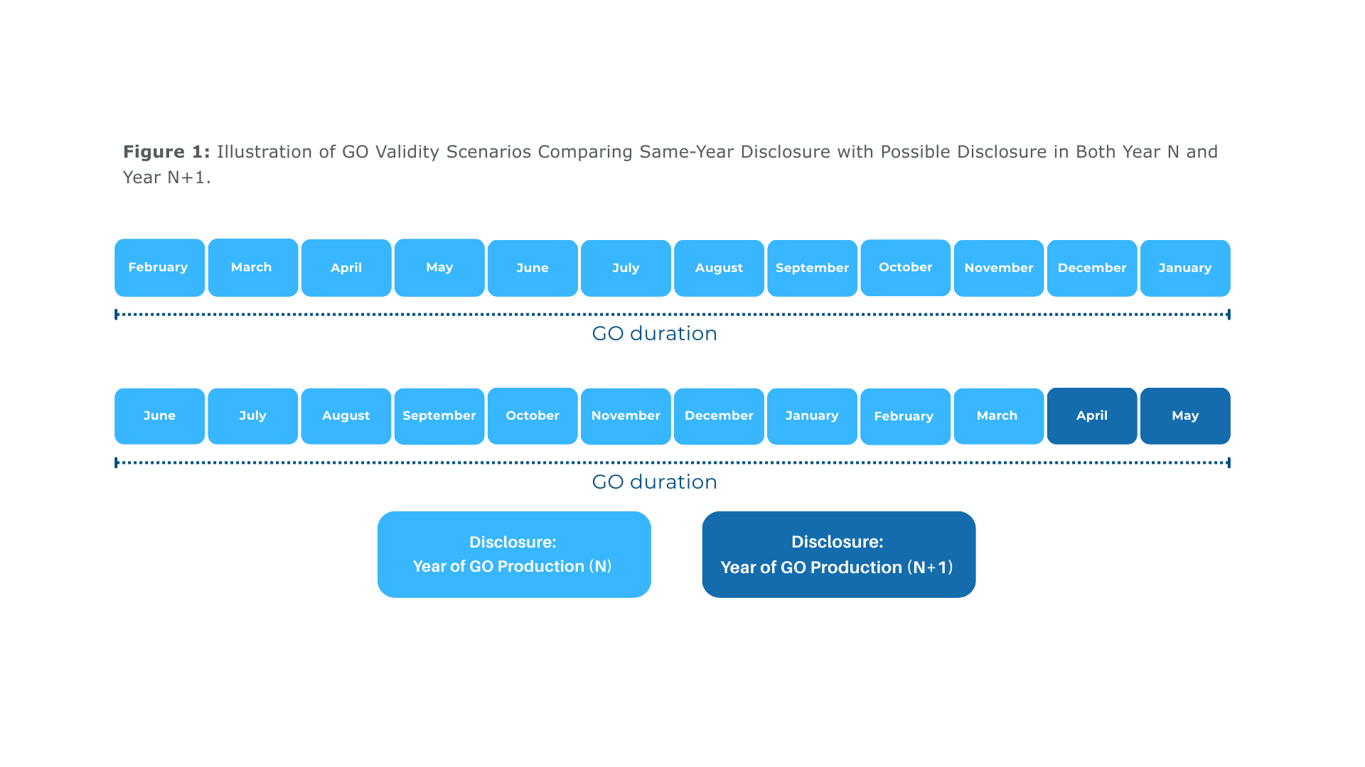 During this period, GOs must be cancelled (redeemed) by the buyer to prove the renewable claim. The timing of the cancellation plays a key role in determining which reporting period a GO can support. Many European countries follow an annual disclosure cycle in which electricity consumption for year N can be supported by cancelling GOs for that year until the end of the first quarter of year N+1. If a GO is not cancelled by this disclosure deadline, while still within its validity period, the certificate can no longer be used for year N and may only be applied to the following reporting year (N+1), as illustrated in Figure 1 .