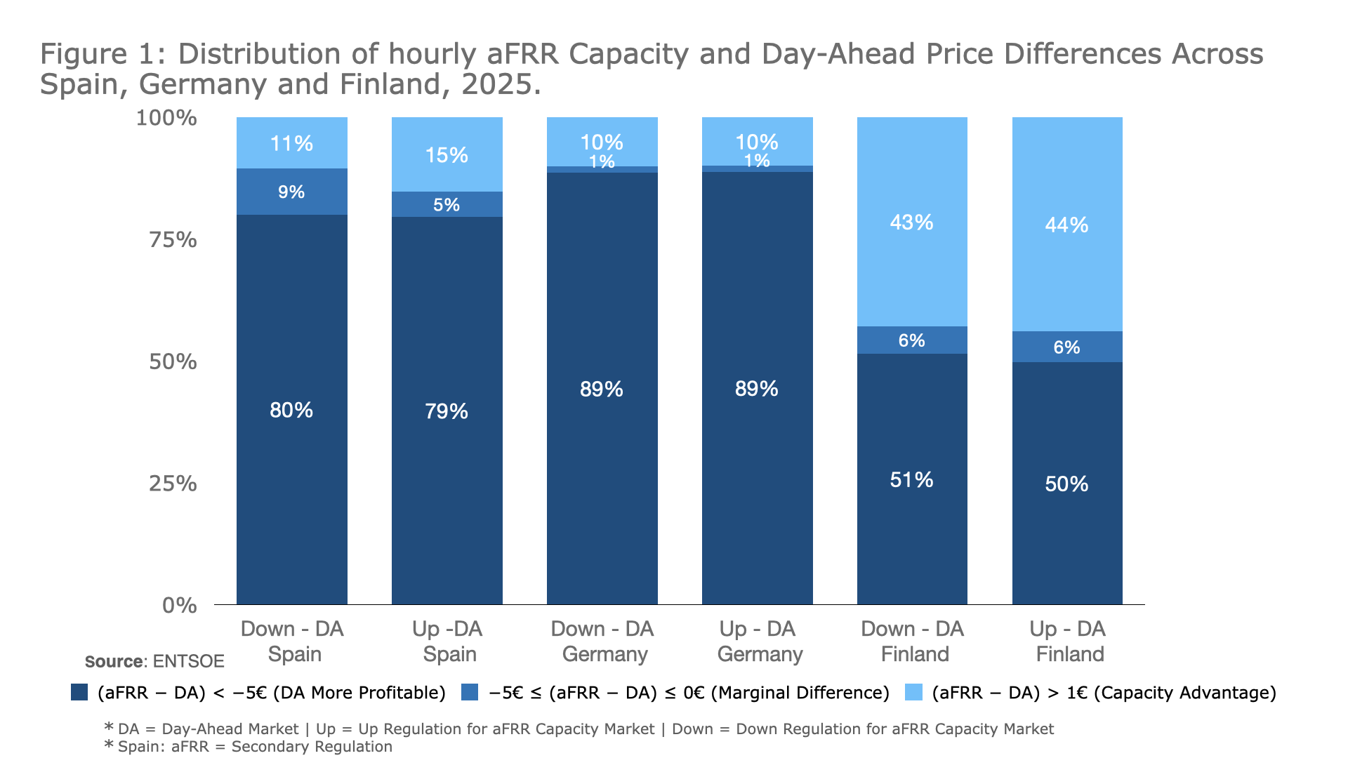 As a way to reduce exposure to wholesale price volatility and avoid periods of zero or negative prices, Finland in 2025 proved to be an attractive market for participation in the aFRR capacity market, with aFRR prices exceeding day-ahead prices 40% of the time. This advantage is largely due to its more flexible participation framework. In contrast, Spain and Germany impose stricter requirements, such as regulation zones and longer commitment durations, which limit accessibility for solar and wind producers. As a result, these markets offer fewer opportunities for renewable assets to use aFRR participation as a strategy to reduce dependence on day-ahead price dynamics.
