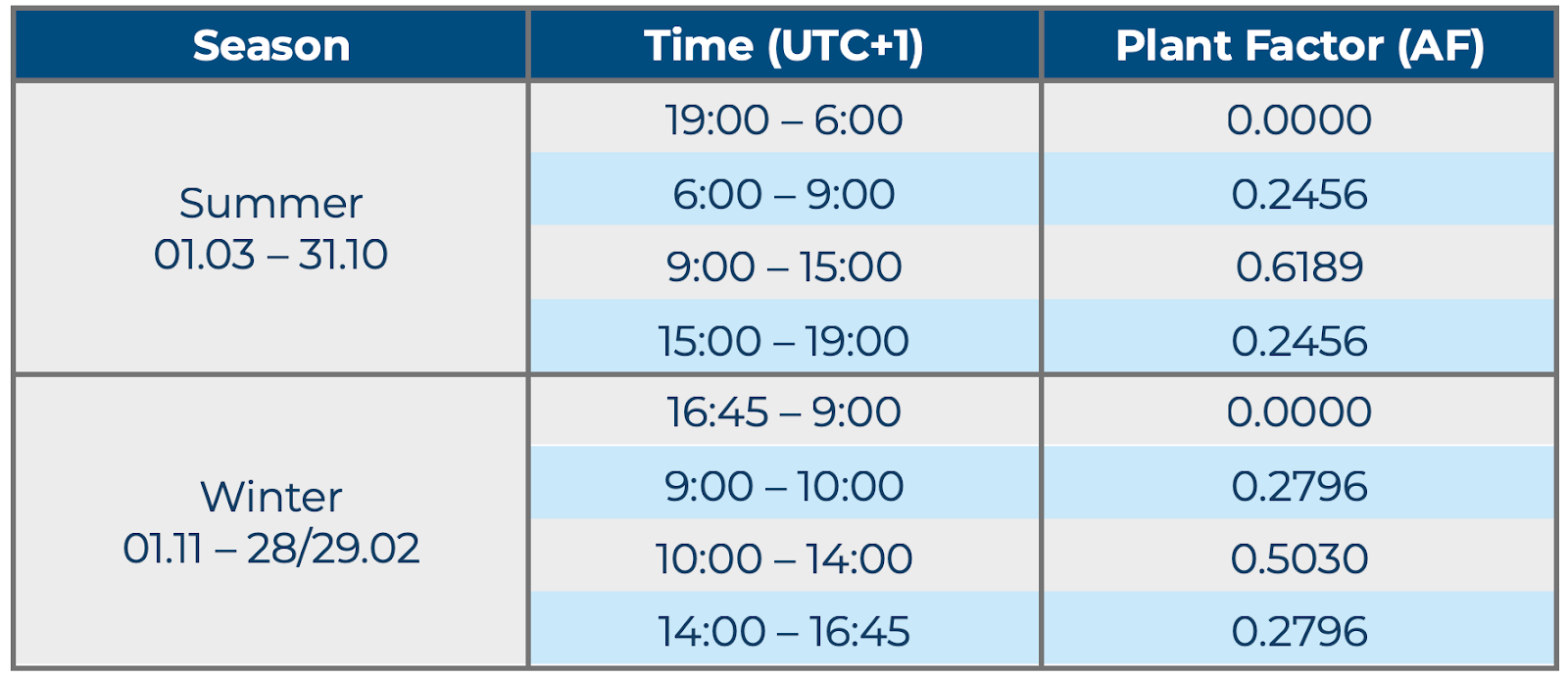 AF : Plant factor determined based on the season and time of day, according to the table below.
