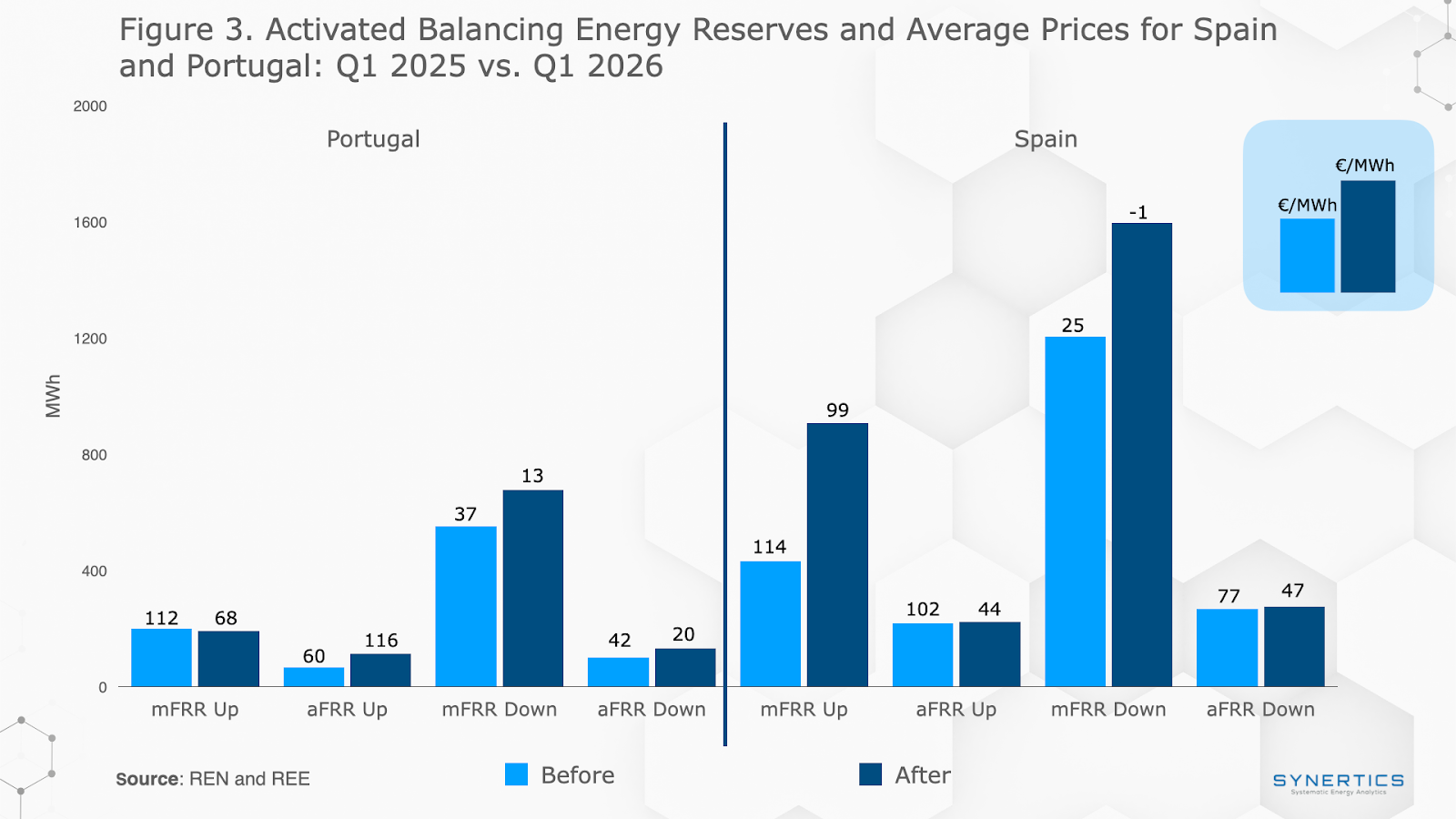 As the Replacement Reserve served as a long-duration balancing service, its discontinuity has primarily impacted other ancillary services, most notably mFRR in Spain. Comparing the first quarter of 2025 to 2026, average prices shifted drastically from 25.37 to -1.5 €/MWh. Given that Spain was historically one of the largest contributors to the RR market, this price volatility has been significantly more pronounced there than in Portugal.