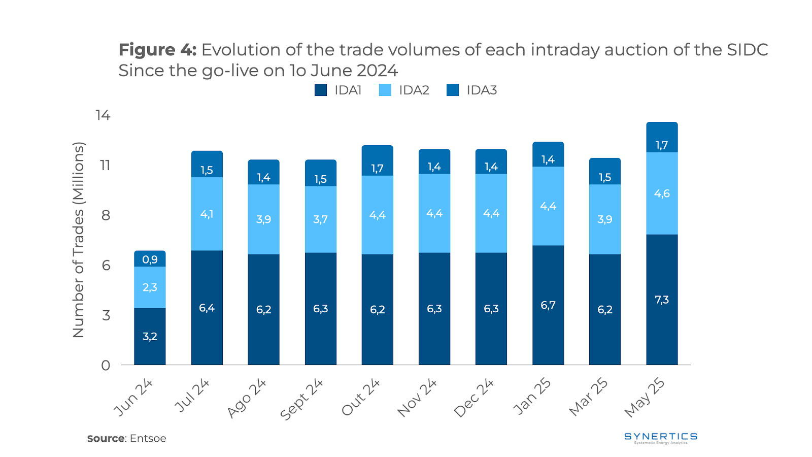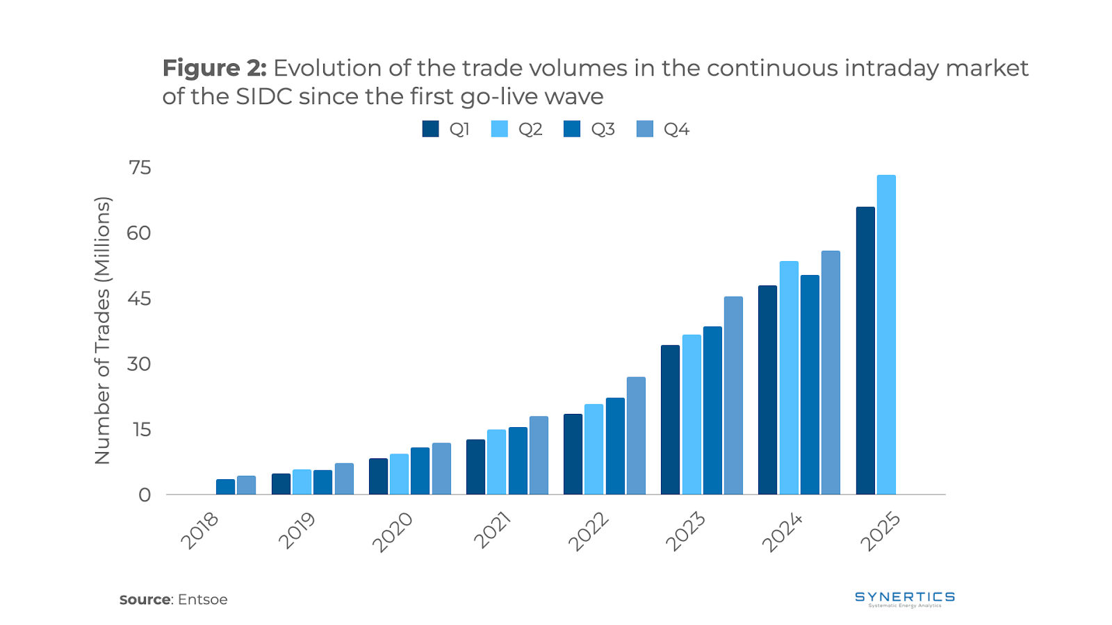 In recent years, the Continuous Intraday Market has experienced significant growth, showing an exponential increase in trading volumes since its inception, as illustrated in Figure 2. This expansion has been primarily driven by the rising share of renewable generation and the progressive extension of SIDC coverage, culminating in almost 75 million trades in Q2 2025.