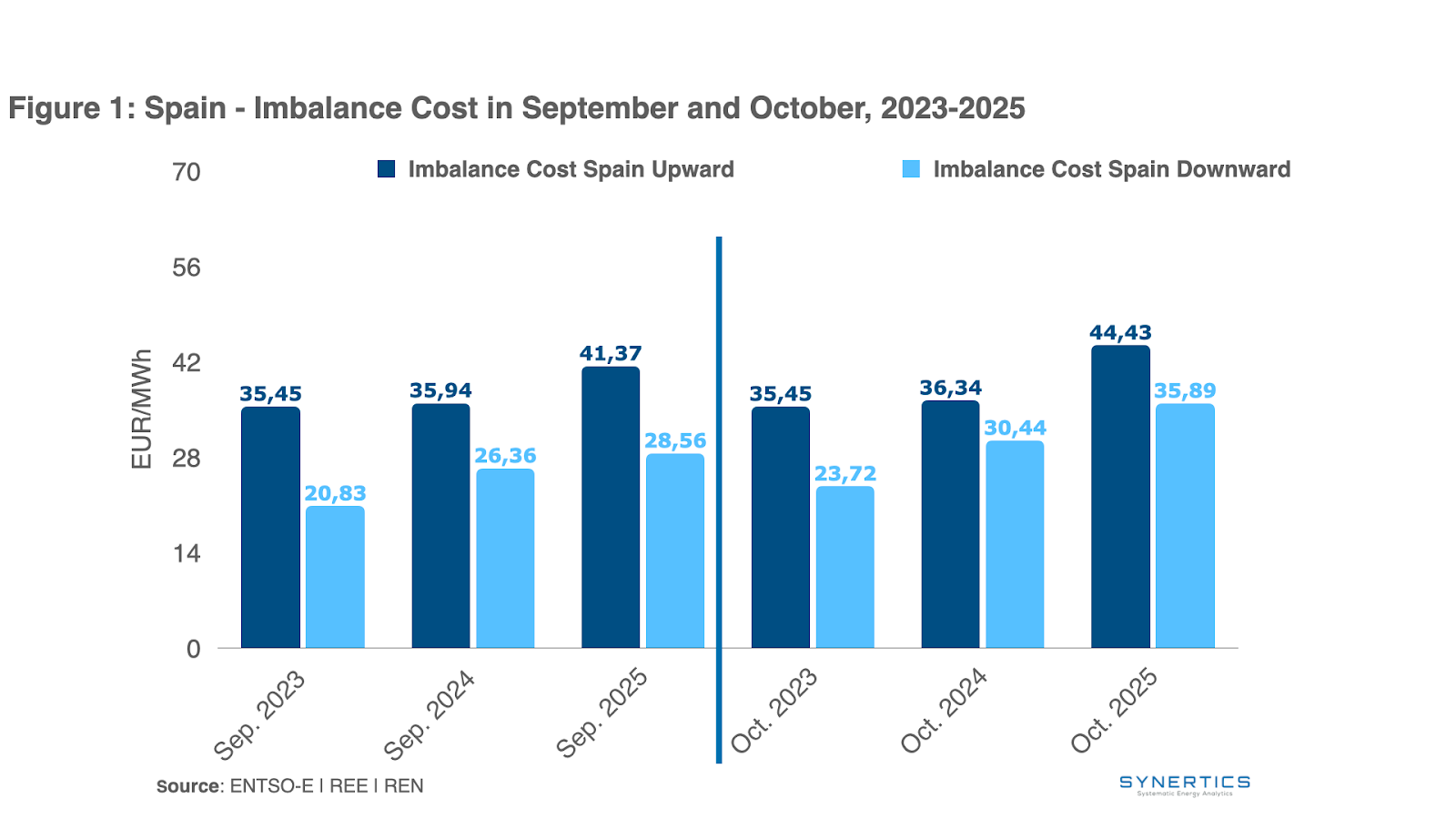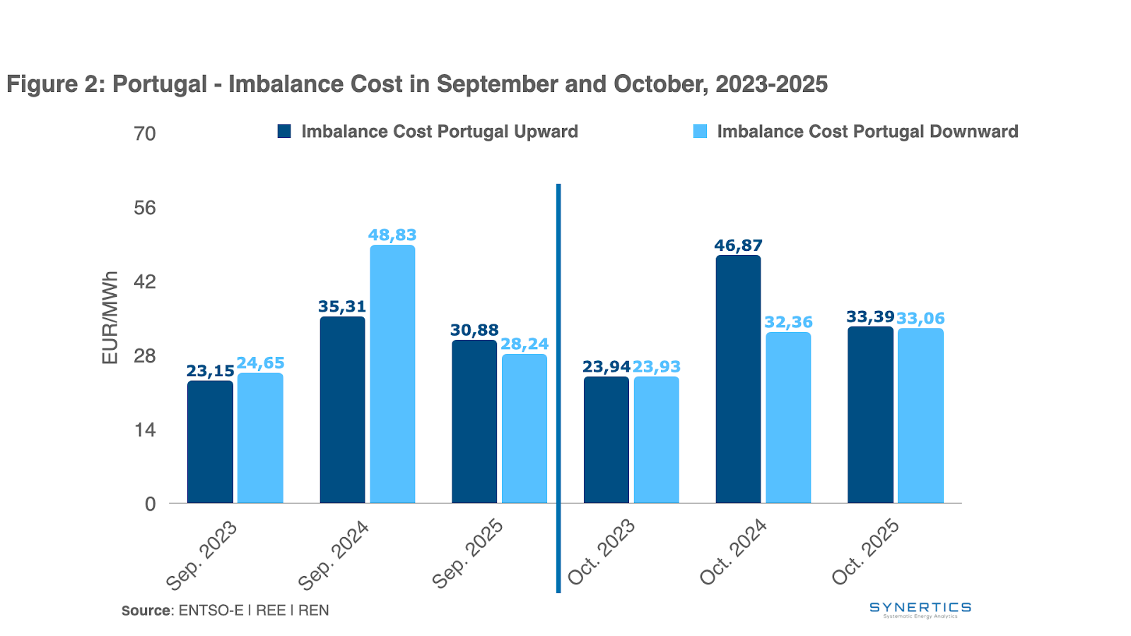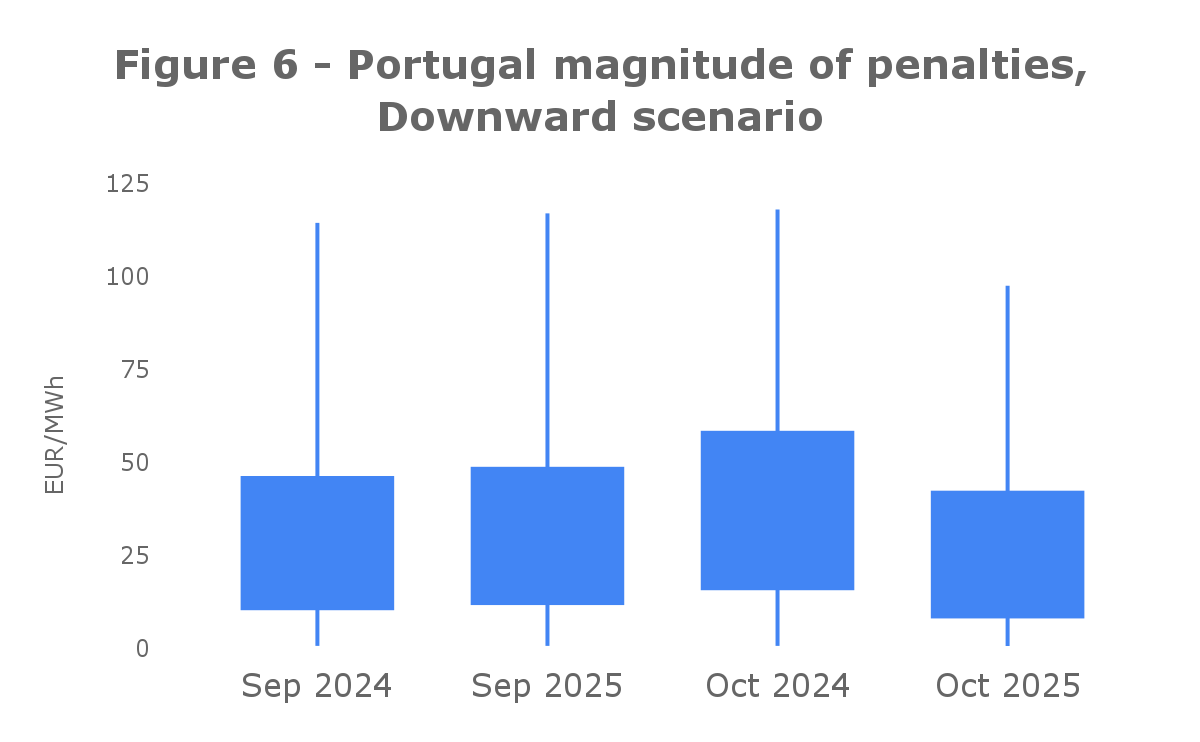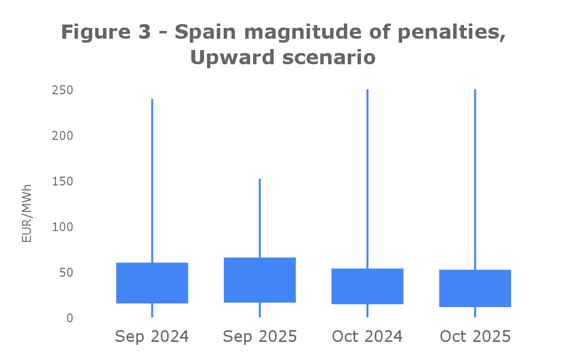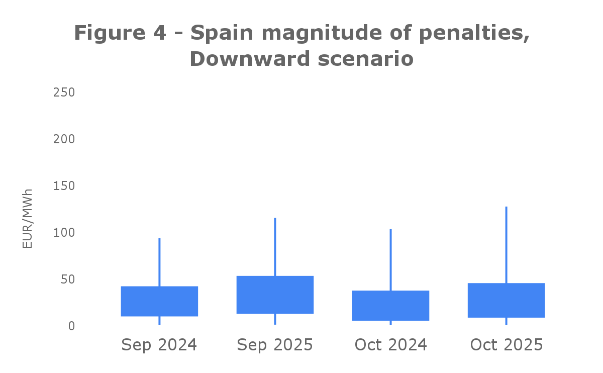 In Spain, as it’s illustrated in Figure 1, there was an increase of 3 €/MWh for upward and over 7 €/MWh for downward deviations between this year and last year October. However, September over the last three years also registered an increase similar to October, leading to a conclusion that this small increase happens each year and it can't conclude a direct relation to the DA market new shift. The yearly increase in imbalance severity is likely driven by the growing volume of energy traded in the electricity market and by unfavourable weather conditions, which leads to larger forecasting errors and, consequently, higher imbalance costs.