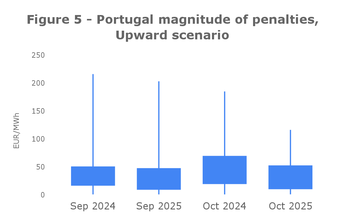 For Portugal, a reduction of about €13/MWh can be observed in the upward imbalance severity, with no significant change in the downward case for the period of October 2025 and 2024. However, comparing 2025 October to 2023, the behaviour is the same, meaning that 2024 was more of a distinct year than 2025, which is the first month of the new change in the DA market. The same behaviour can be seen in September, where 2024 was more out of the pattern in the last three years, meaning of bigger penalization to market participants in 2024 than in 2025. Although Portugal shows a different behaviour from Spain, the overall conclusion remains the same: there is no clear relationship between the new shift and the change in imbalance cost overall.