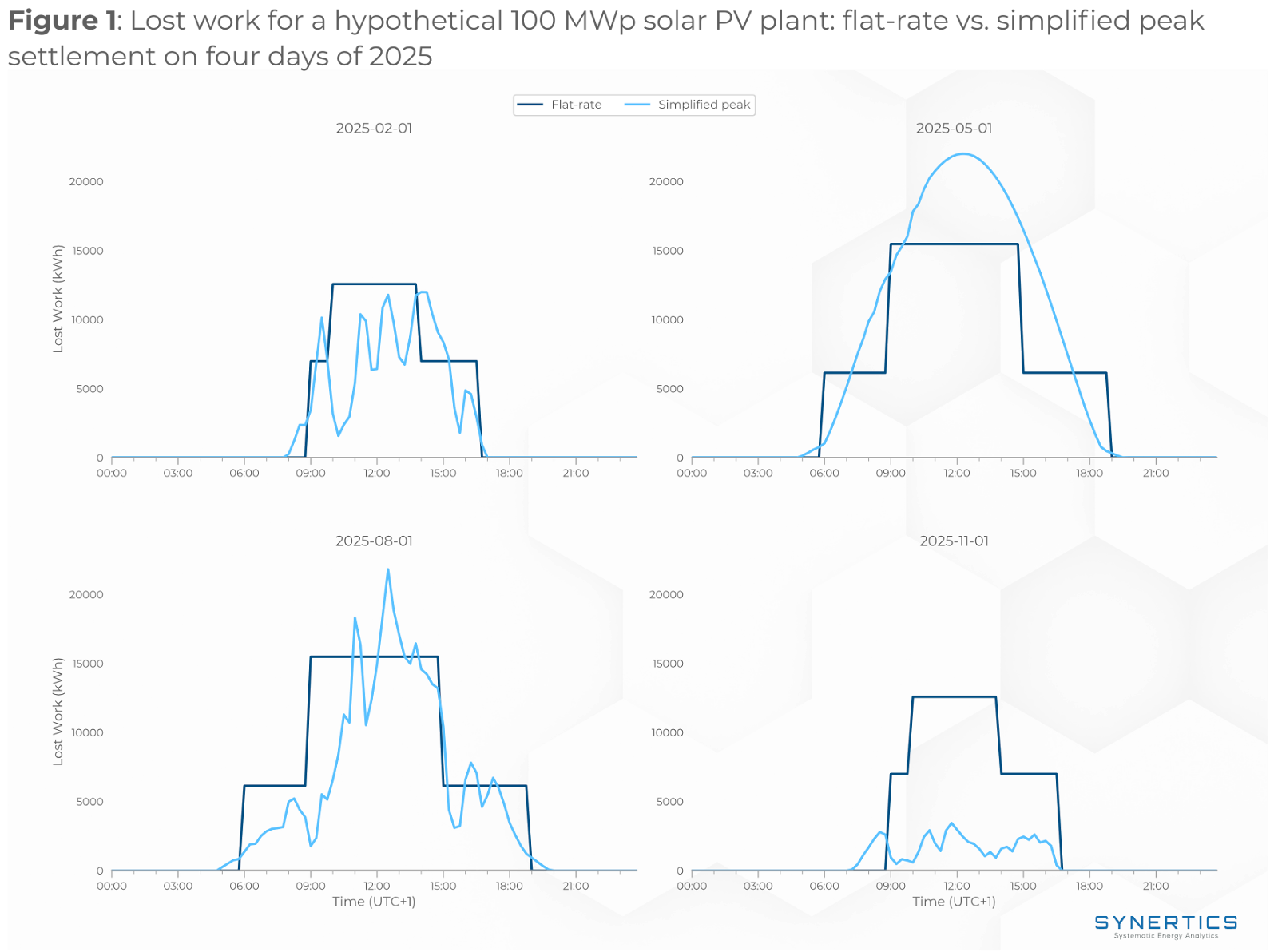 To show how these methods diverge in practice, we compare the flat-rate and simplified peak methods for a hypothetical 100 MWp solar plant in Germany. We selected four representative days in 2025: 1 February (winter), 1 May (spring), 1 August (summer) and 1 November (autumn).